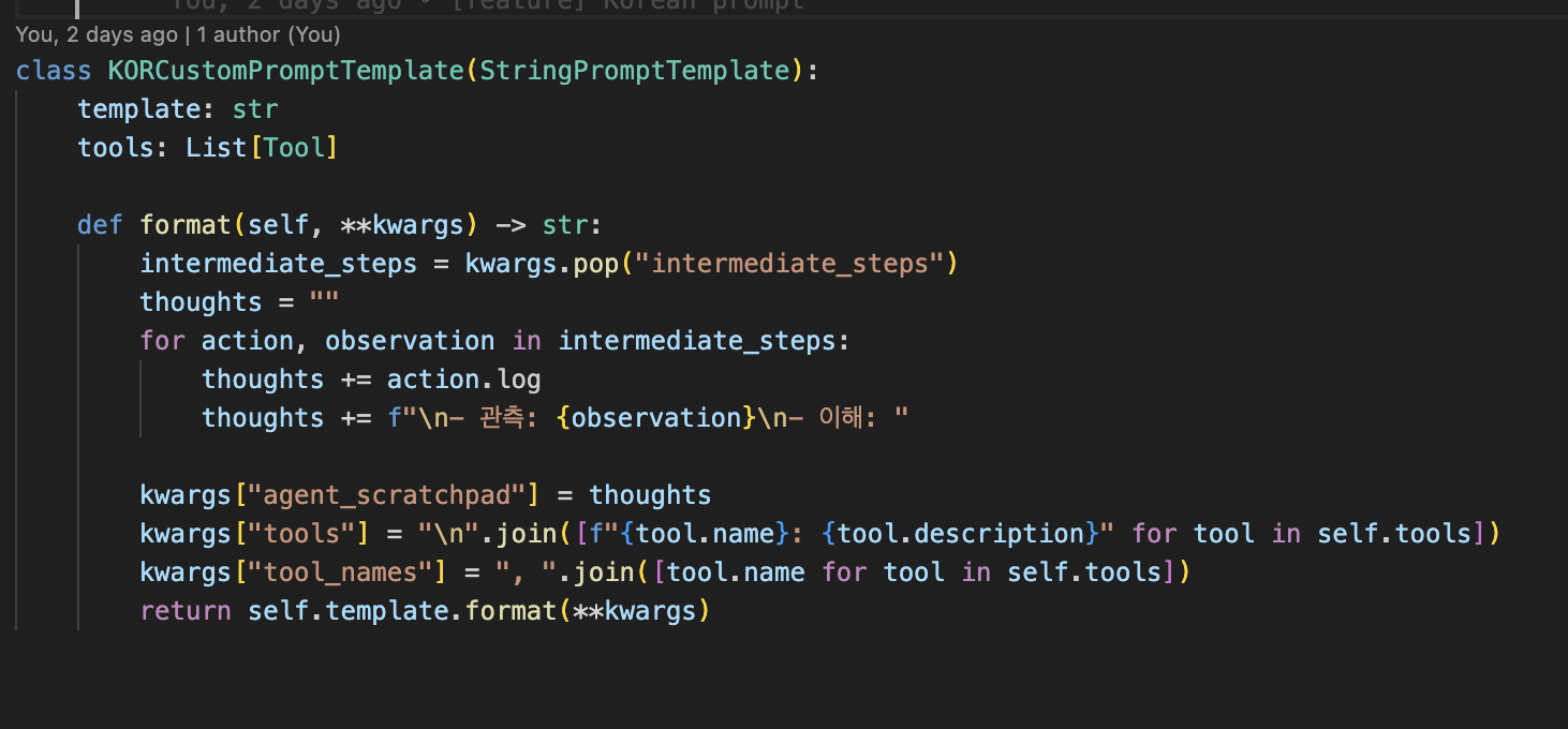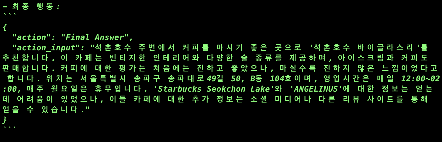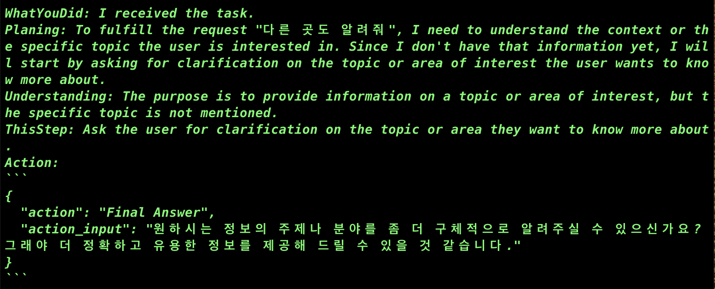 Output Parser 를 커스터마이즈 하지 않았으므로 필요부분은 영어로 남겨둔다.
