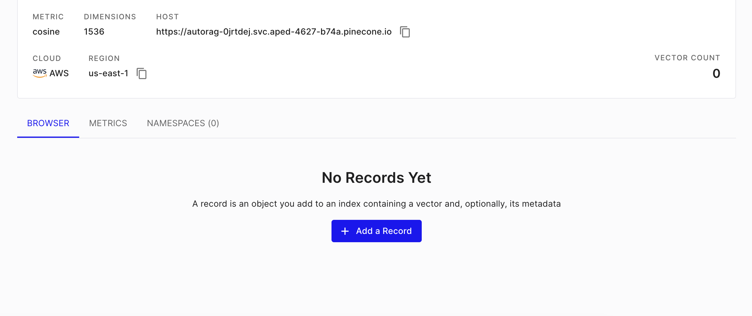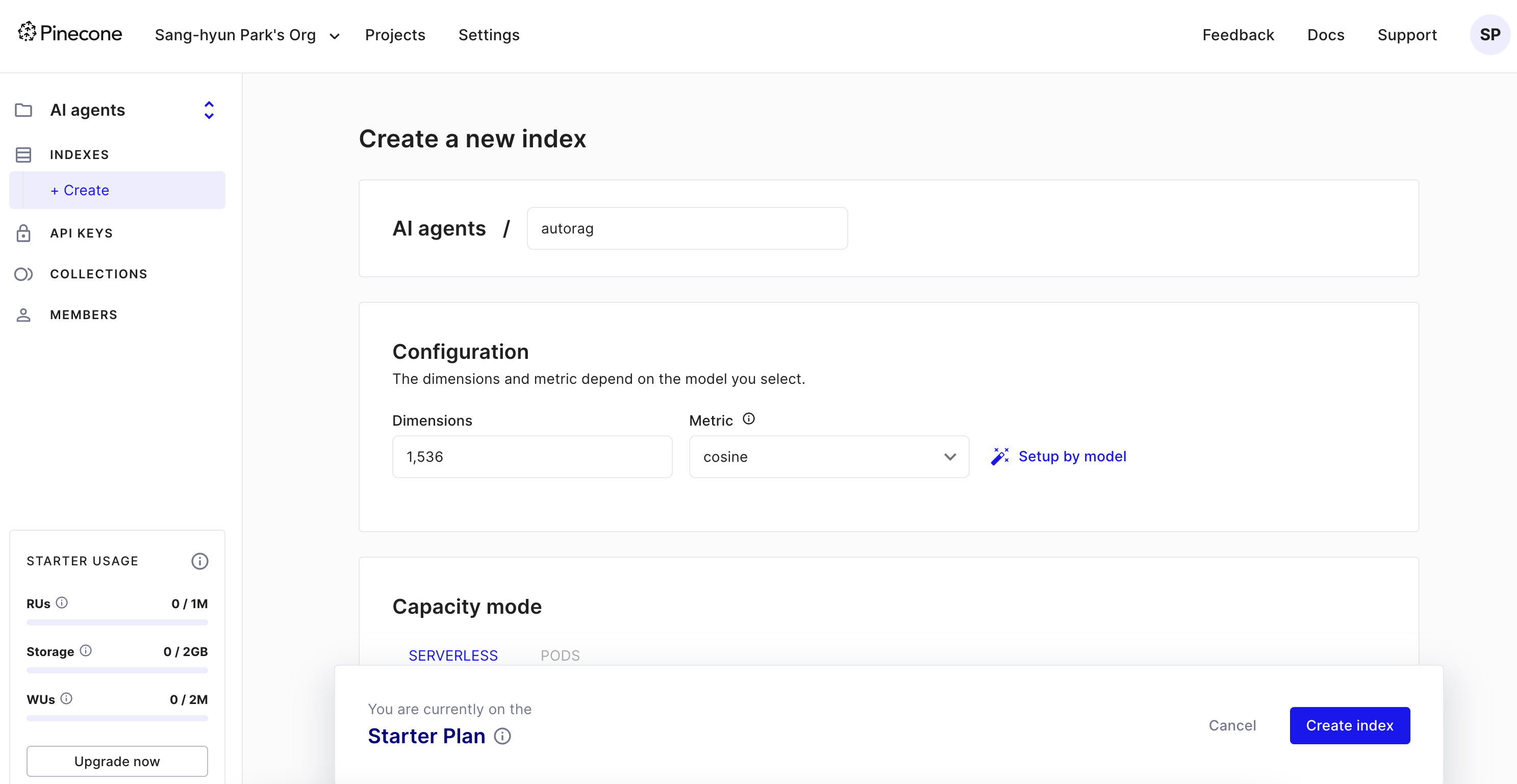 파인콘 데이터베이스의 스타터플렌으로 벡터데이터베이스를 하나 만들어준다.