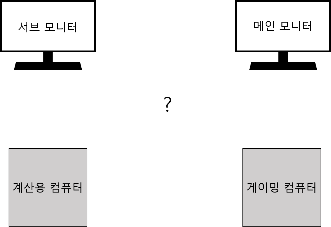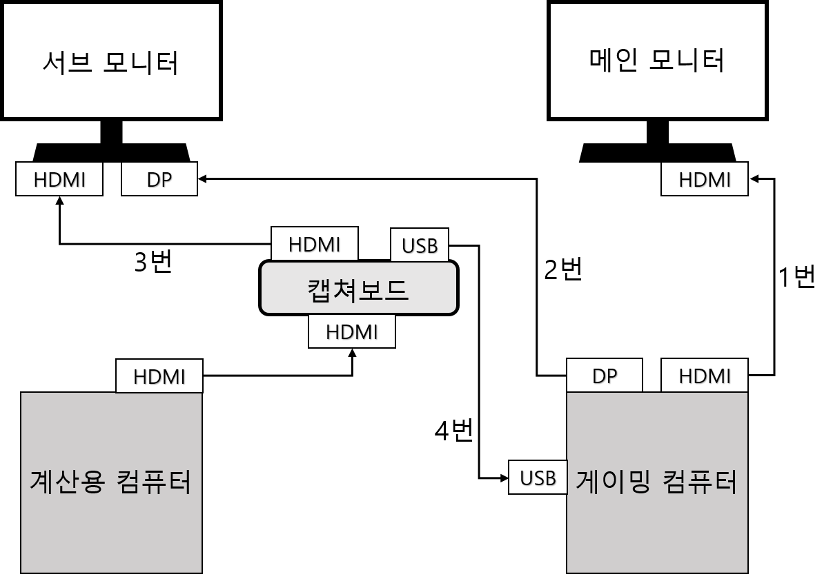 1. 게이밍 컴퓨터 -> 매인 모니터 연결 (게임 해야함.)