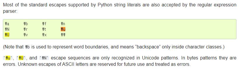 파이썬의 공식 docs에서 보면 \u와 \U는 오로지 유니코드 패턴으로만 인식된다고 한다...